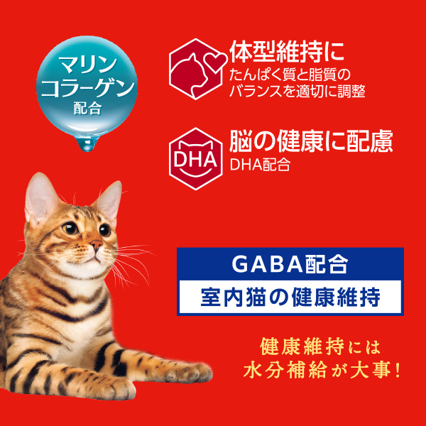 魚介類(カツオ、フィッシュエキスパウダー、マリンコラーゲン)、鶏ササミ、大豆タンパク、油脂類(植物性油脂、動物性油脂(DHA含む))、小麦タンパク、グラニュー糖、セレン酵母、GABA、ミネラル類(Ca、K、Cl、Mg、Fe、Cu、Mn、Zn、Ⅰ)、増粘安定剤(加工でん粉、キサンタンガム)、ビタミン類(A、B1、B2、B6、B12、D、E、K、ナイアシン、パントテン酸、ビオチン、葉酸、コリン)、タウリン、酸化防止剤(EDTA-2Na、ビタミンC)