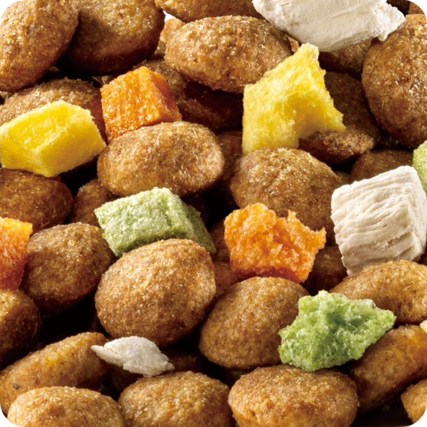- 素材そのまま、栄養も損なわれない国産鶏肉フリーズドライと、カゴメの野菜ピューレー&ペーストを使用した3種の野菜フリーズドライをトッピング。