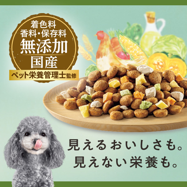 - 国産鶏肉の旨みに、8種類の野菜パウダーを配合し、必要な栄養が1度にとれる『おいしい栄養バランス』設計。