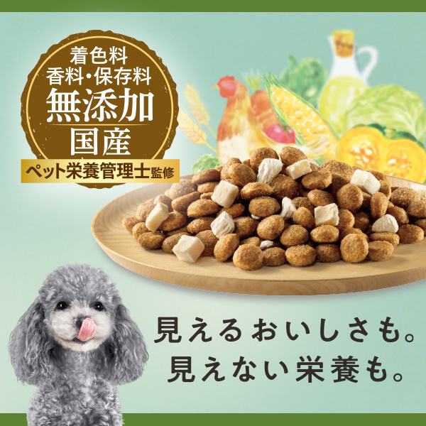 - 国産鶏肉の旨みに、8種類の野菜パウダーを配合し、必要な栄養が1度にとれる『おいしい栄養バランス』設計。