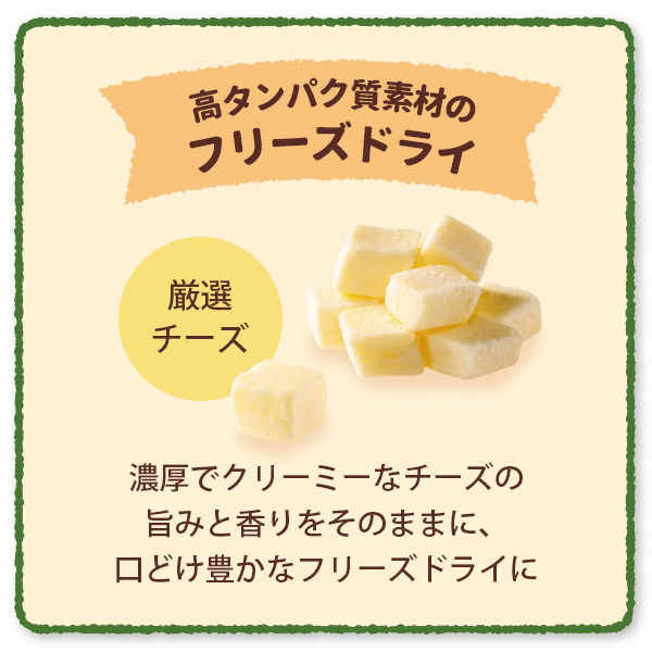 - 素材そのまま、栄養も損なわれない国産鶏肉フリーズドライと、クリーミーな味わいと深みあるコクをより感じられる厳選チーズのフリーズドライをトッピング。