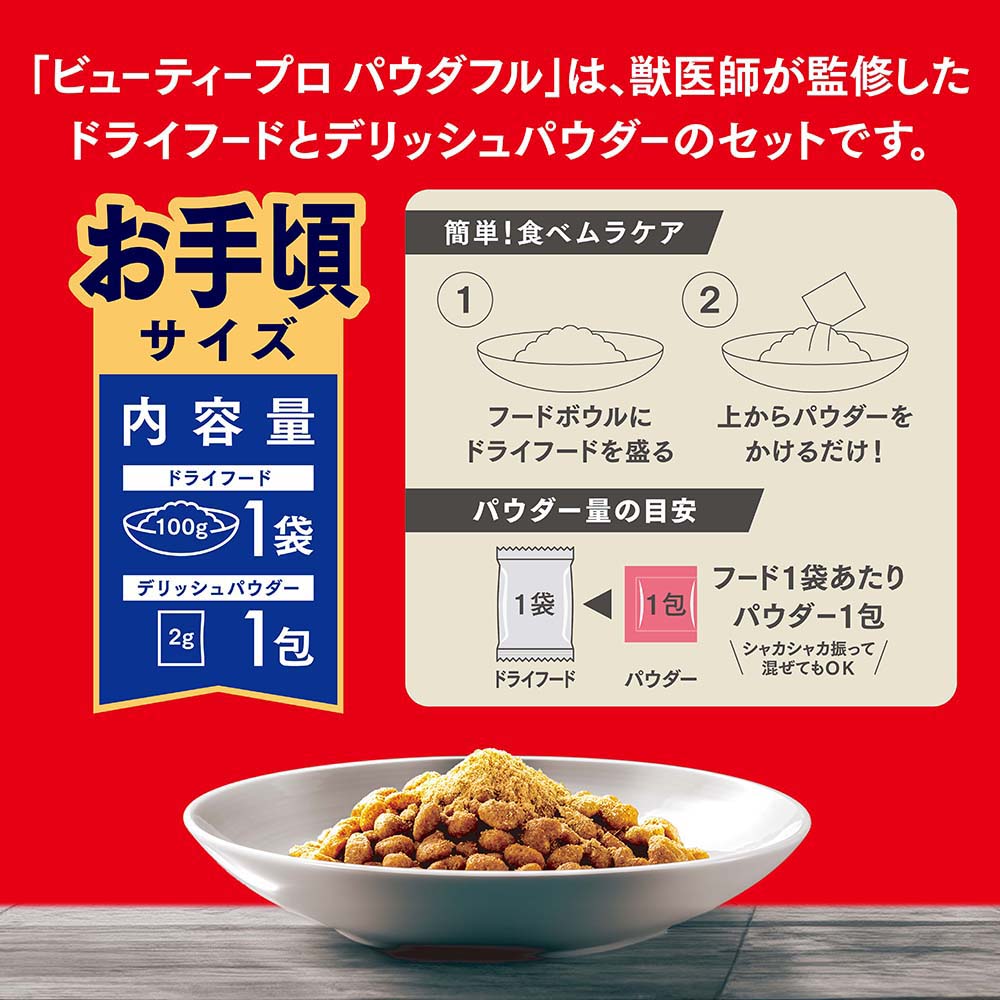 - 【使い方】フードボウルにドライフードを盛り、上からパウダーをかけるだけ。