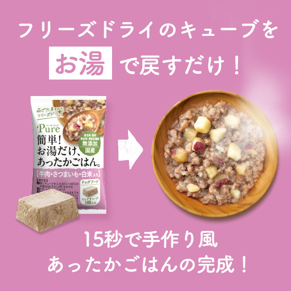 - お湯で戻すだけの手軽さで、素材の美味しさと香り高い温かいフードを愛犬にあげることができる「フリーズドライウェットフード」