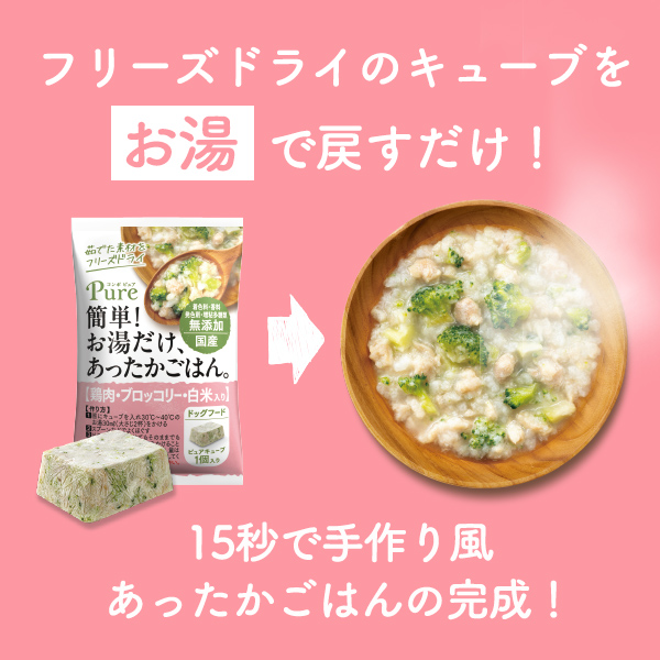 - お湯で戻すだけの手軽さで、素材の美味しさと香り高い温かいフードを愛犬にあげることができる「フリーズドライウェットフード」