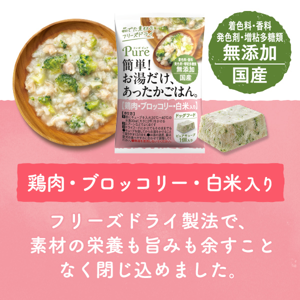 鶏肉、ブロッコリー、でん粉、でん粉分解物、白米、酸化防止剤(ビタミンE)