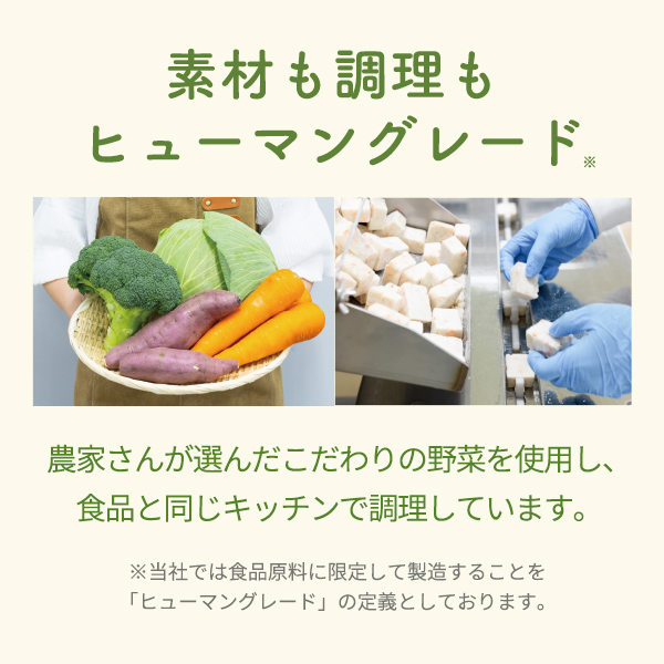 - 肉や野菜原料の選別から加工まで厳しい基準を設けた国内食品工場で調理し、高い品質を実現。