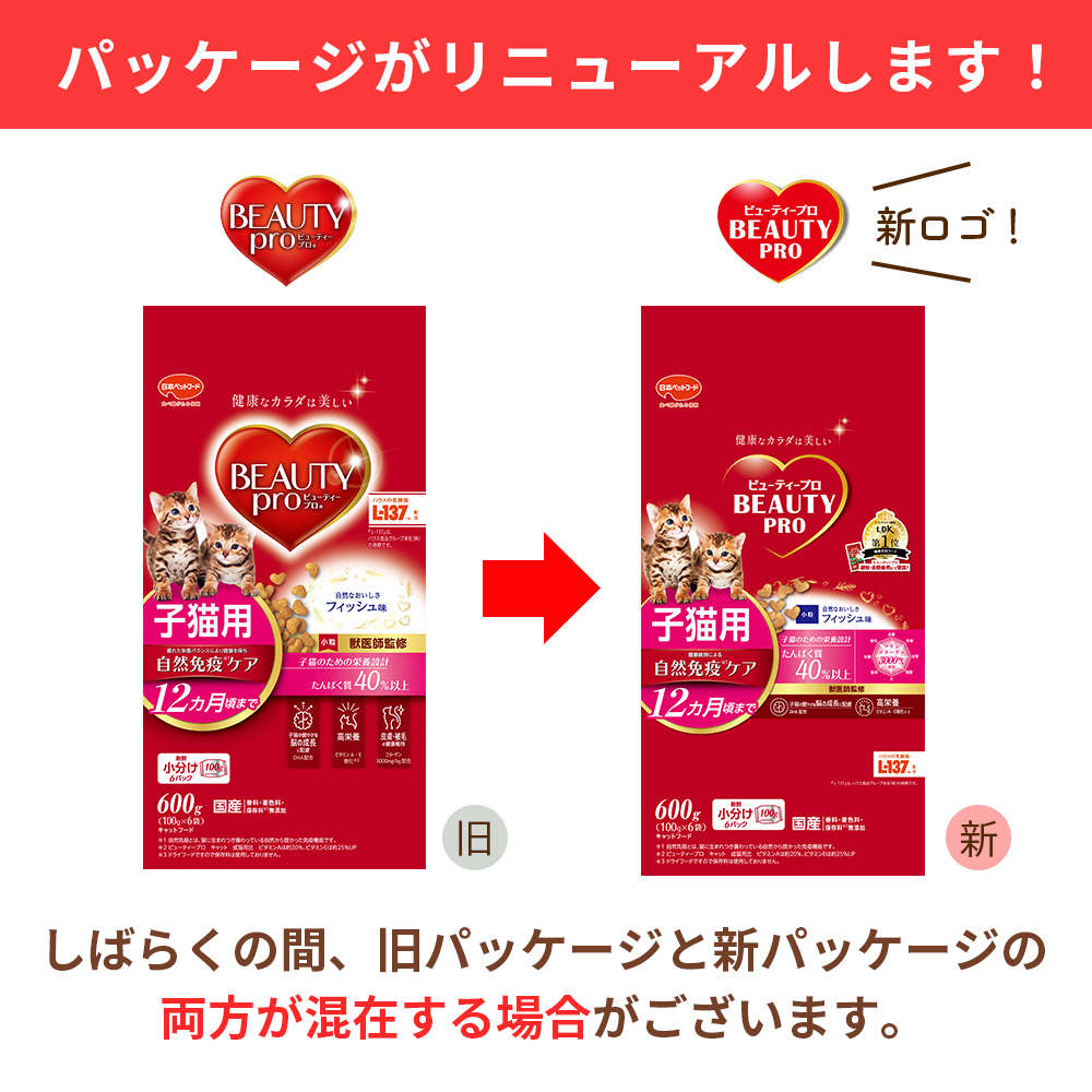 - 子猫期の健康で元気な成長を願い、たんぱく質40%以上、ビタミン強化。(ビューティープロ キャット 成猫用比約25%アップ)