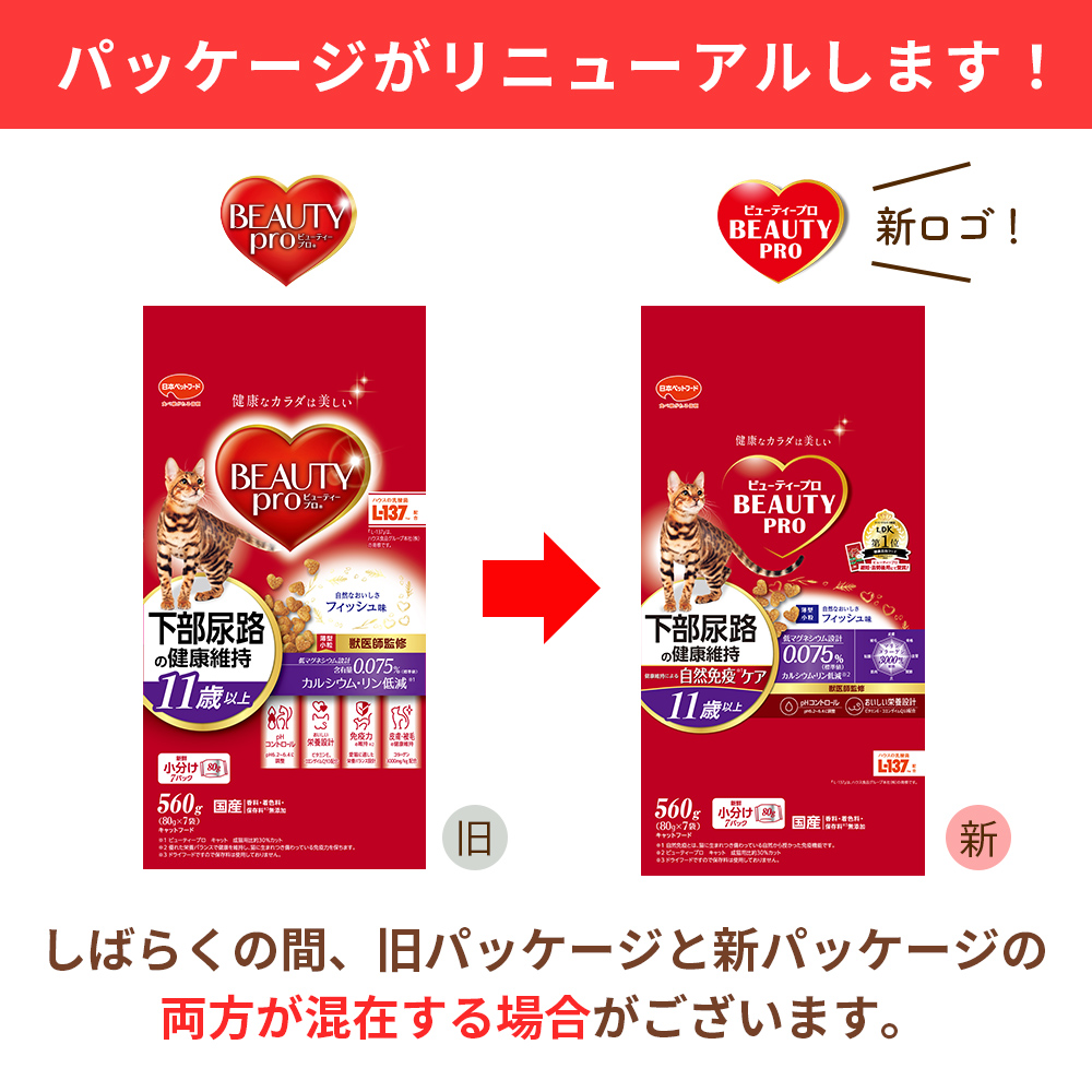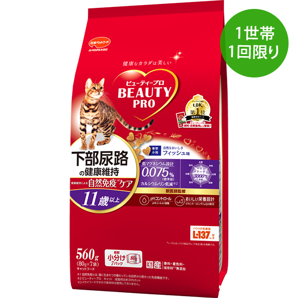 - 結石に配慮し、マグネシウムを0.075%(標準値)に調整。カルシウムとリンを低減。(ビューティープロ キャット 成猫用比約30%カット)