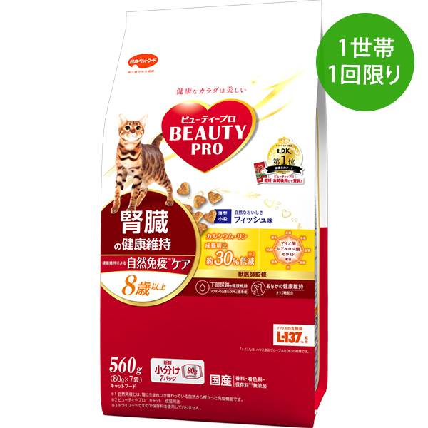 - 腎臓の健康維持のために、カルシウムとリンを低減。(ビューティープロ キャット 成猫用比約30%カット)さらにマグネシウム0.09%(標準値)で下部尿路の健康にも配慮。