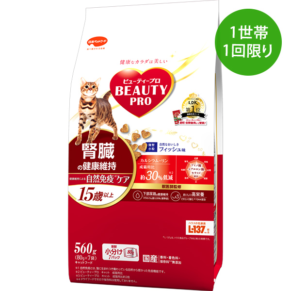 - 腎臓の健康維持のために、カルシウムとリンを低減。(ビューティープロ キャット 成猫用比約30%カット)さらにマグネシウム0.09%(標準値)で下部尿路の健康にも配慮。