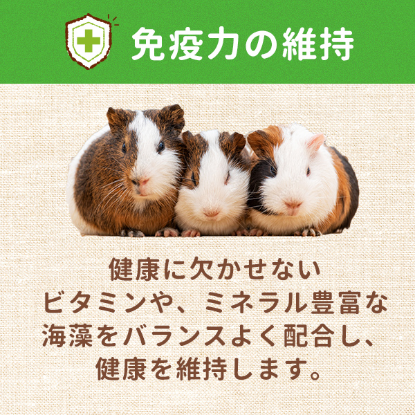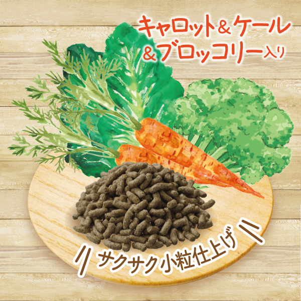 - 牧草ベースの粒に、3種の野菜パウダーを配合し、モルモットの大好きな味に。